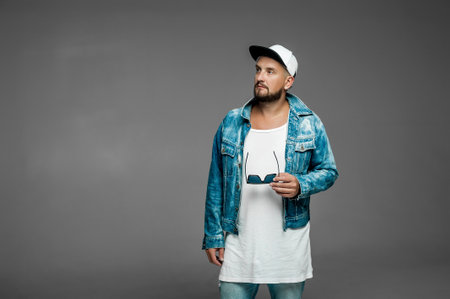handsome bearded man in baseball cap and denim jacket holding sunglasses isolated on gray