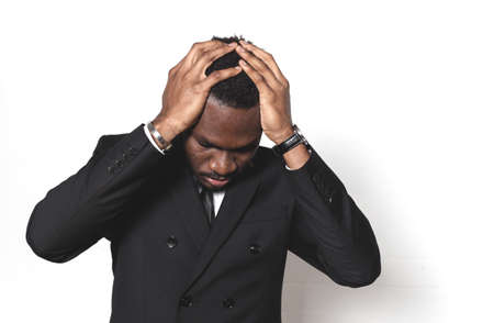Portrait of a young Afro American in a business suit. emotions on the face. man holds his head, stress at work, headache, irritation. isolated on white background, free space for text