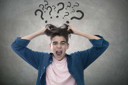 Young Adult with Curly Hair Showing Expression of Anger and Frustration Against Plain Background in Portrait Mode