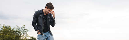 Redhead and longhaired young guy covering face with hands on the background of city and sunset. Side view
