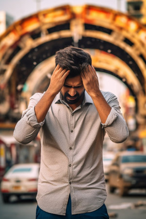 Close up stressed worried ill sick unhappy sad Arabian man touching painful head suffer headache pain unhealthy Indian guy male at parking suffering migraine cancer symptom tumor high blood pressure