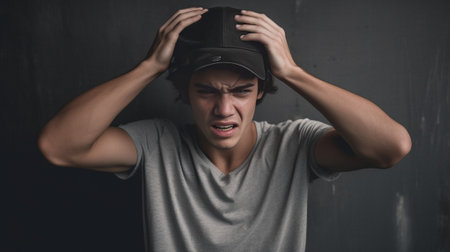 Terrible headache Frustrated young man touching his head with hands and making face while standing against grey background : Generative AI