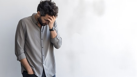Clean shaved young man touching forehead with hands. Dissatisfied or regret about wrong decision.