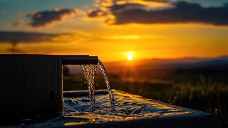 As the sun sets over a lush green field, clear water ripples through a rustic wooden irrigation trough. The gentle flow symbolizes sustainability, natural resources, and the peaceful rhythm of rural life, offering a moment of tranquility.