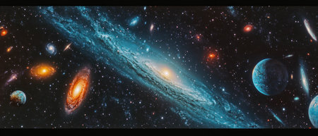 Deep space background showcasing luminous galaxies and celestial bodies across the cosmos