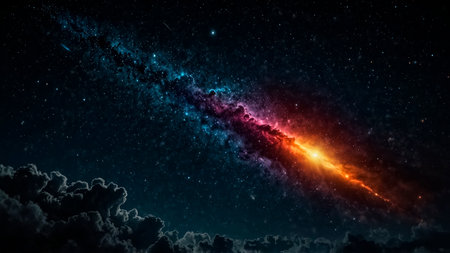 A breathtaking view of the Milky Way galaxy showcases vibrant colors and intricate patterns of stars and cosmic dust against a dark night sky, revealing the beauty of the universe