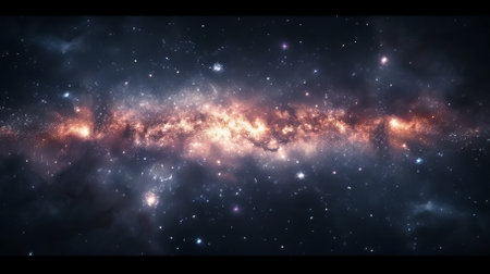 A panoramic view of the Milky Way galaxy, showcasing vibrant colors, sparkling stars, and swirling cosmic dust.