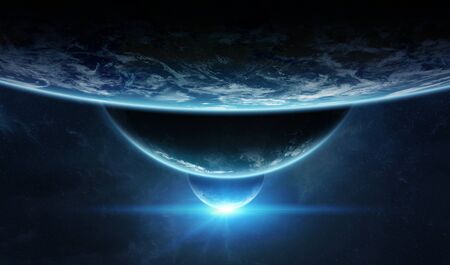 Distant planet system in space with exoplanets during sunrise 3D rendering