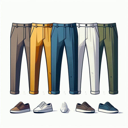 A stylish man showcases a modern casual outfit consisting of light gray pants and sneakers. The backdrop features a contemporary gray wall, enhancing the urban aesthetic.