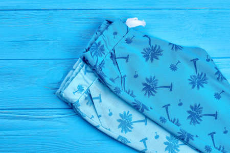 Modern design baby summer pants. Close up of palm print toddlers trousers on blue wooden background. Kids summer fashion.