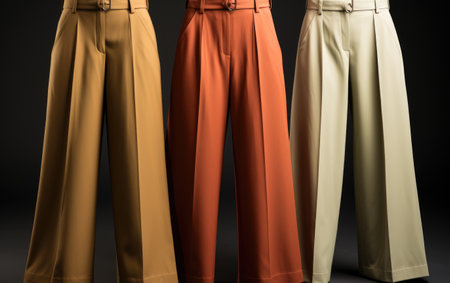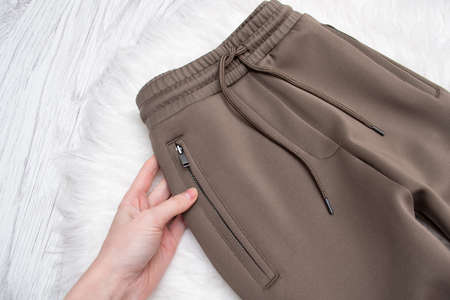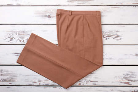 Female beige trousers, top view. Women formal pants on white wooden background. Female classic outfit.