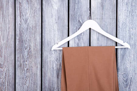 Close up trousers on hanger. Flat lay, top view. Dark wooden desk surface background.