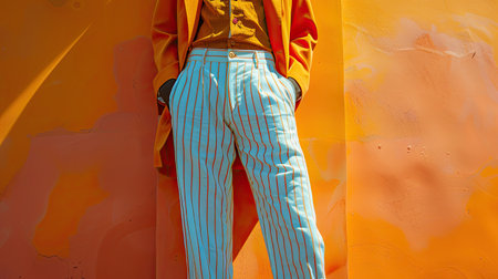 Fashionable Person in Striped Pants and Orange Jacket Posing Against a Vibrant Orange Wall