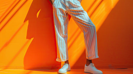 ** Fashionable Person in Striped Pants and White Sneakers Posing Against Orange Background