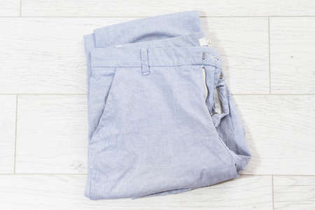 Men's hands get out of the box or put the trousers (pants, jeans) in the box. The concept of organizing a men's wardrobe, choosing clothes. Blue wooden background.