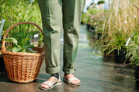 Legs of female gardener in pants and sandals standing on wet floor of large contemporary hothouse between flowerbeds with seedlings