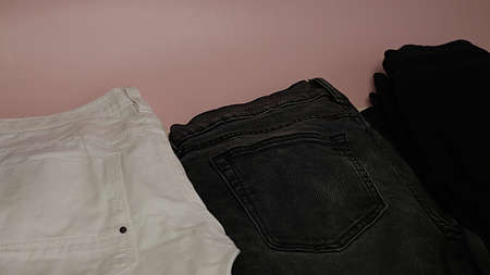 Jeans of different colors are scattered on a pink background. Grey, black, light, white jeans are on the table. background with jeans