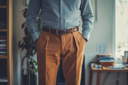 Stylish man in a button up shirt and tailored trousers exuding confidence in a modern living room, ideal for business or lifestyle themes