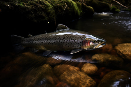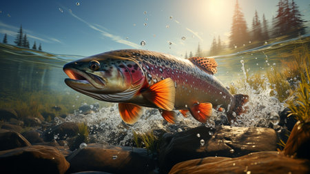 Trout jumps from water in river, view of wild fish in freshwater of mountain stream and sky. Concept of salmon, wildlife, fresh, nature and fauna. Generative AI