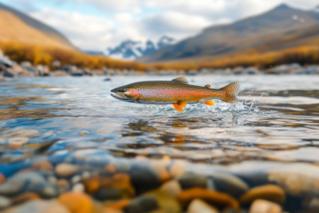A vibrant rainbow trout is leaping out of a clear river, its scales glistening under the sun. The stunning backdrop features majestic mountains and a serene environment, showcasing natures beauty.