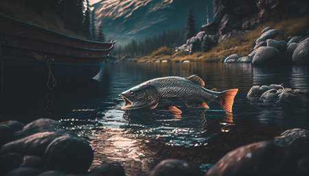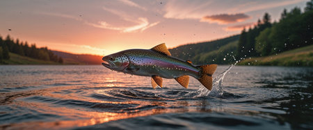 AI Generated. Trout leaping from water at sunset in scenic lake landscape