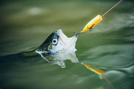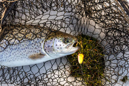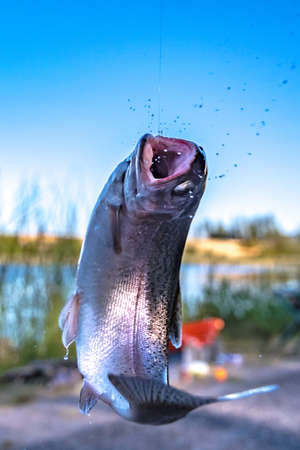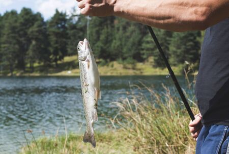 Good day for fishing. fishing on lake. Good catch. fish on hook. stalemate and hopelessness. fly fishing trout. recreation and leisure. trout bait. catch fish. fall into trap. hobby sport activity