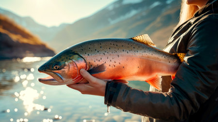 A woman is posing with a large Atlantic salmon in her hands. AI Generated