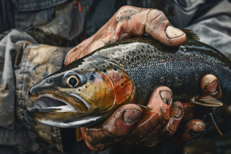 This captivating image presents a close-up view of a fisherman's hand gently cradling a fish. The composition focuses on the intimate connection between the fisherman and his catch, capturing the essence of the fishing experience. The detail-rich image showcases the rough textures and calloused skin of the fisherman's hand, highlighting the dedication and skill involved in the art of fishing. Witness the tangible result of the fisherman's labor as he holds the fruit of his efforts, symbolizing the harmony between humans and the bounties of the sea.