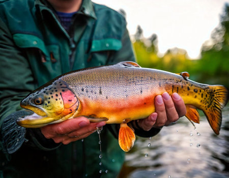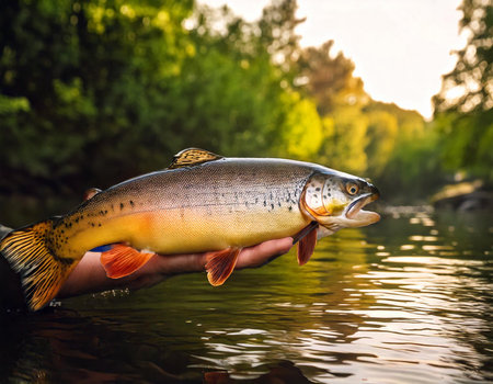 A close-up of a brown trout held by an angler with a blurred natural water background. the vibrant patterns of the fish's scales are highlighted, capturing the essence of freshwater fishing and outdoor adventures. Generative AI