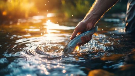 The fisherman releases the trout into the river.