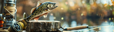 Fishing competition trophy featuring a leaping fish, placed on a rustic wooden base beside fishing gear