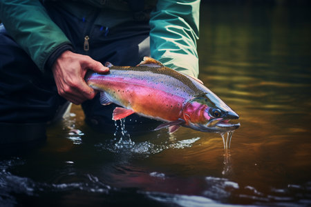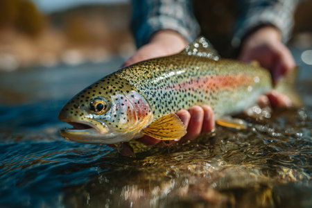Angler carefully releasing a colorful rainbow trout back into the clear river water