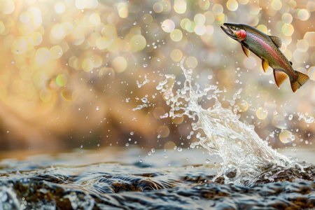 A vibrant rainbow trout leaping out of the water