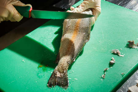 cook hands in gloves clean whole raw trout fish by knife on green cutting board on kitchen table