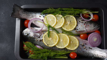 Raw trout on a black wooden table. Home preparation of trout.Healthy diet food. Fresh fish ready for grilling. Fishing industry.
