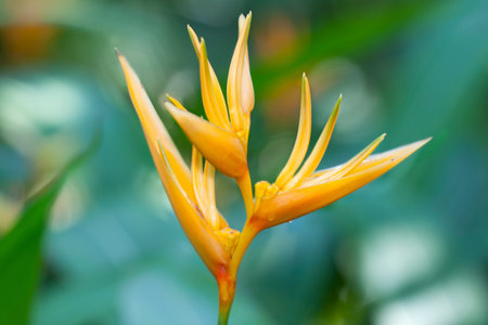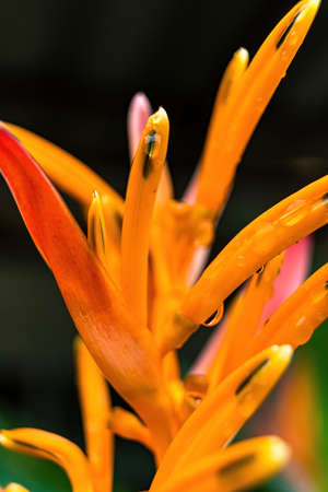 Macro closeup of Yellow orange flower Heliconia psittacorum ,Lobster-claws tropical plants with drop of water nature background.