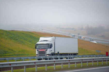 BOBRUISK, BELARUS 26.06.2019: The truck carries cargo on the highway in the evening against the night sky, trailer