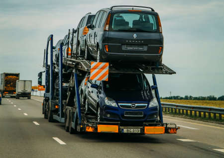 Rothenburg ob der Tauber, Germany - October 12, 2017: The trailer truck transports brand new cars on highway.