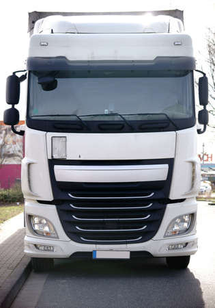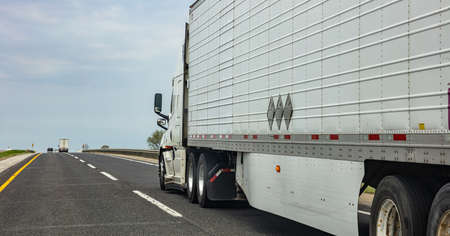 Truck white color on the highway, cloudy sky, closeup side view. USA countryside