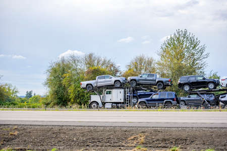 Big rig industrial grade car hauler semi truck tractor transporting vehicles on the modular hydraulic two level semi trailer running on the wide turning divided highway road with trees on the side