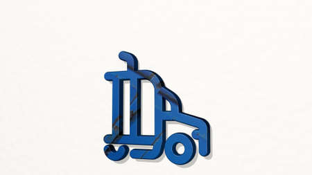 3D representation of truck with icon on the wall and text arranged by metallic cubic letters on a mirror floor for concept meaning and slideshow presentation. illustration and car