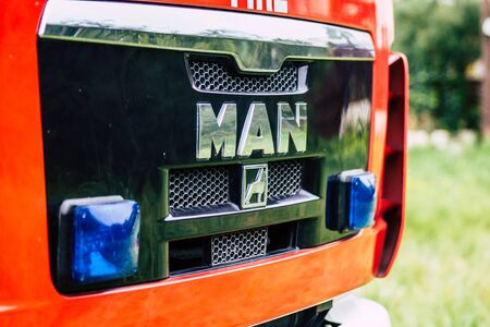Hagen, Germany - August 15, 2019: low angle close-up of American vintage classic car truck front grille