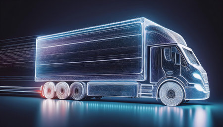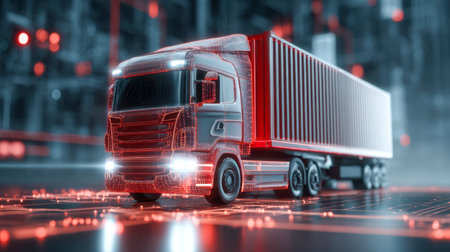 A sleek, neon-lit truck equipped with smart sensors and autonomous features navigates a glowing metropolis, showcasing cutting-edge logistics innovation.