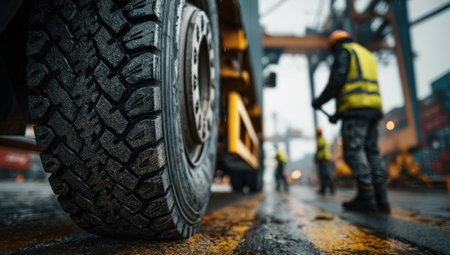 Close-up of a heavy-duty truck tire showcasing its tread, with workers in safety vests managing logistics in a busy industrial environment