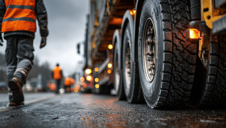 Workers in bright vests are walking alongside large truck tires on a rainy road, highlighting the industrial setting and collaborative effort in transportation