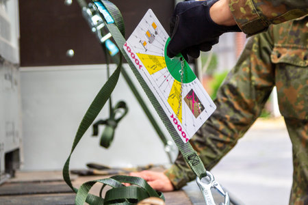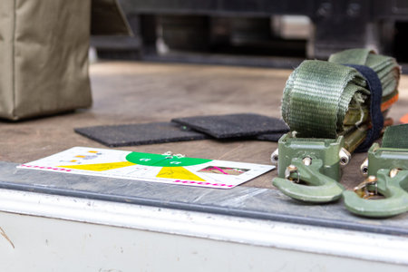 MUNSTER / GERMANY - JULY 2, 2019: Tie down scheme card for cargo transport lashing lies near lashing material.