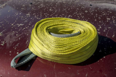 Tow hook with orange strap on car. Towing equipment. Tugging