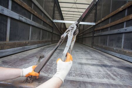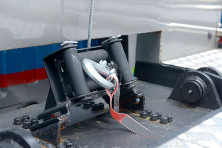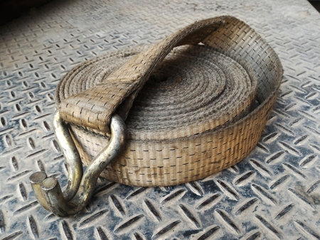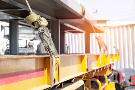 Truck platforms, reinforced anchorage with a ratchet fixing strap to connect an anchorage point on the truck floor. Vertical image, selective focus.