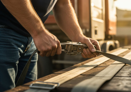 Trucker tightening ratchet straps on a flatbed trailer, ensuring the secure transport of cargo and promoting safety during delivery