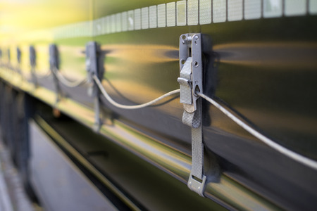 Fragment of Tarpaulin Truck. A line of metal fasteners with straps. Freight commercial transport, logistics. Focus in the foreground.